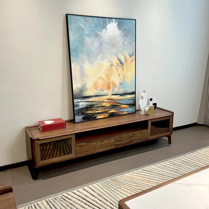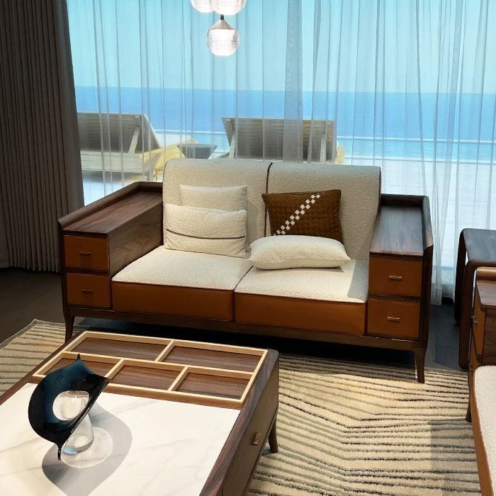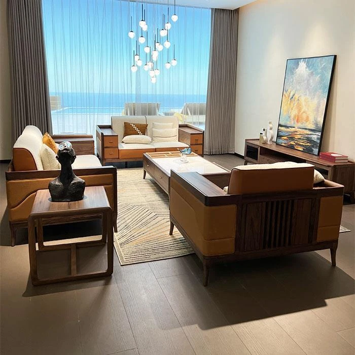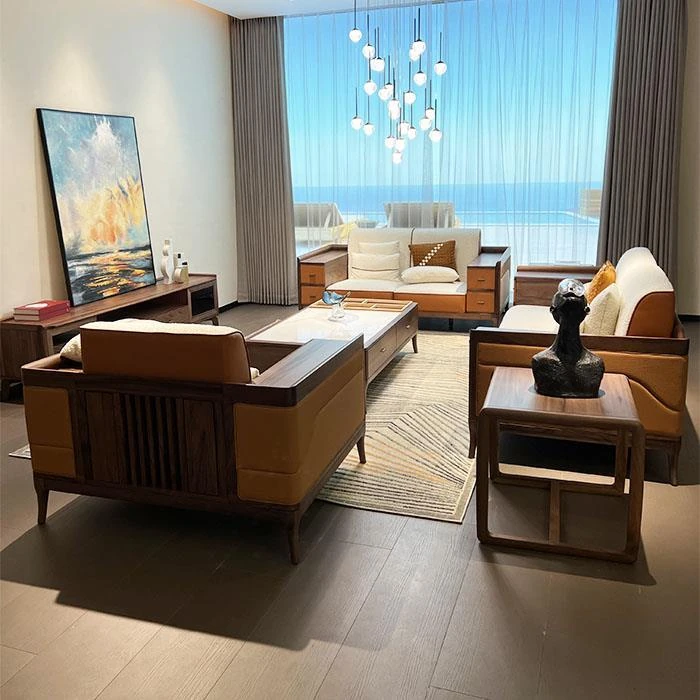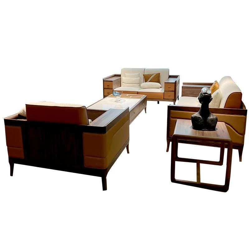 新中式スタイルの北米産ブラックウォールナットソファセット - モダンでシンプルなデザイン、ヴィラやリビングに最適!本革と無垢材を使用したラグジュアリー家具で、快適さとスタイルを両立。