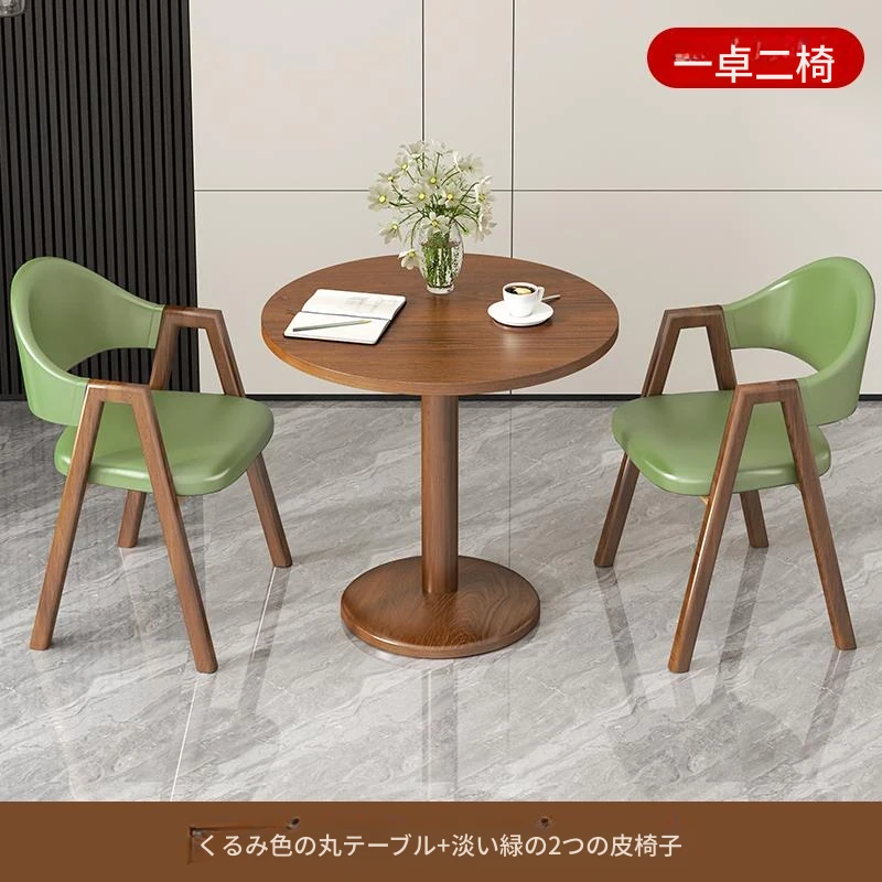 カーキ色皮椅2脚+60ウォールナット色丸テーブル