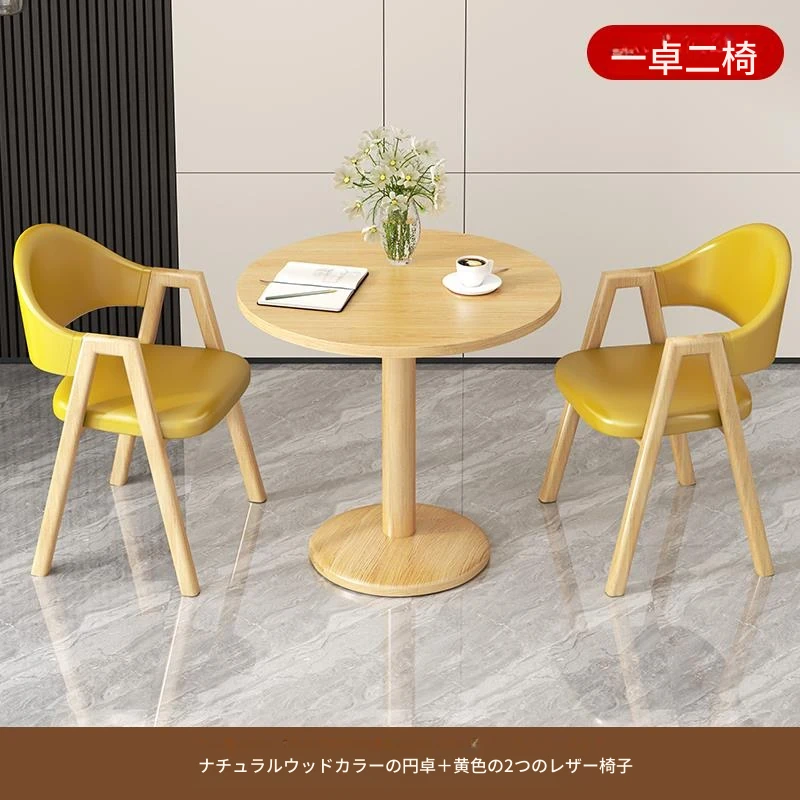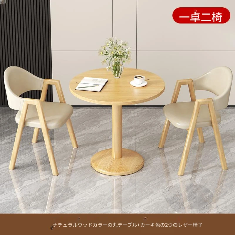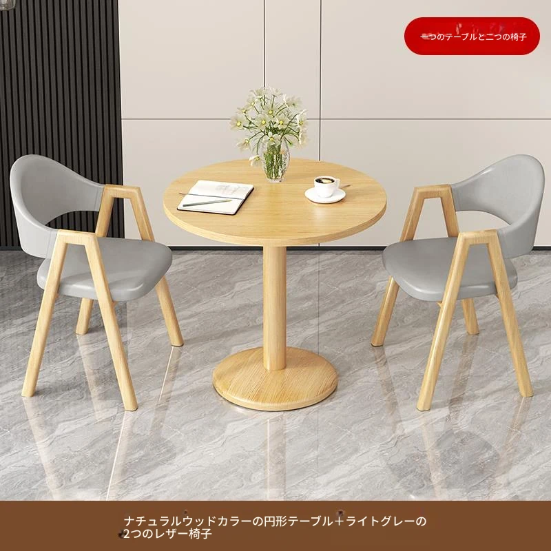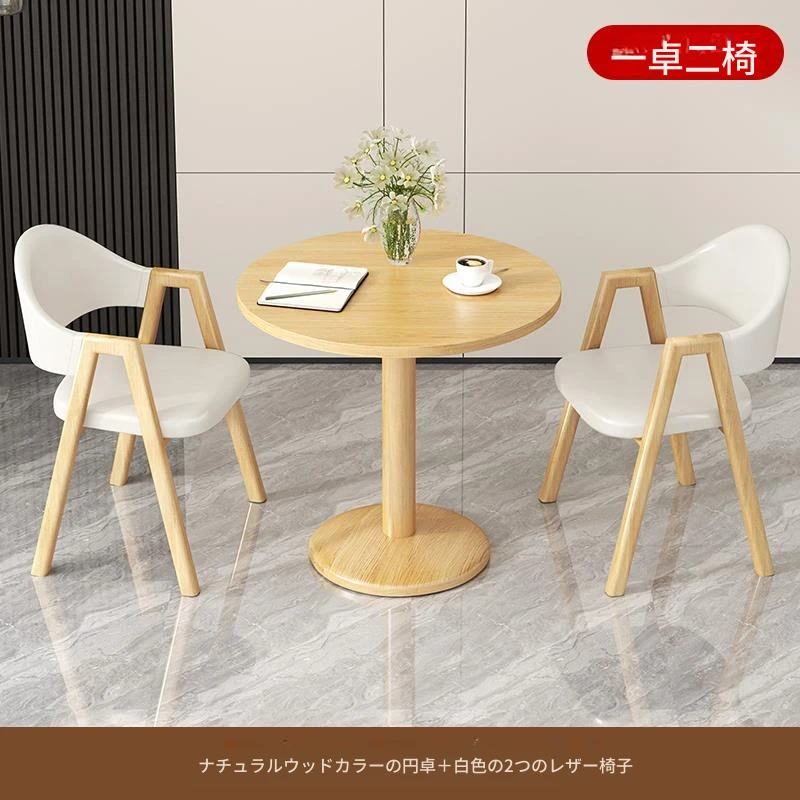 アイボリー色2皮椅+60ナチュラルウッド色丸テーブル