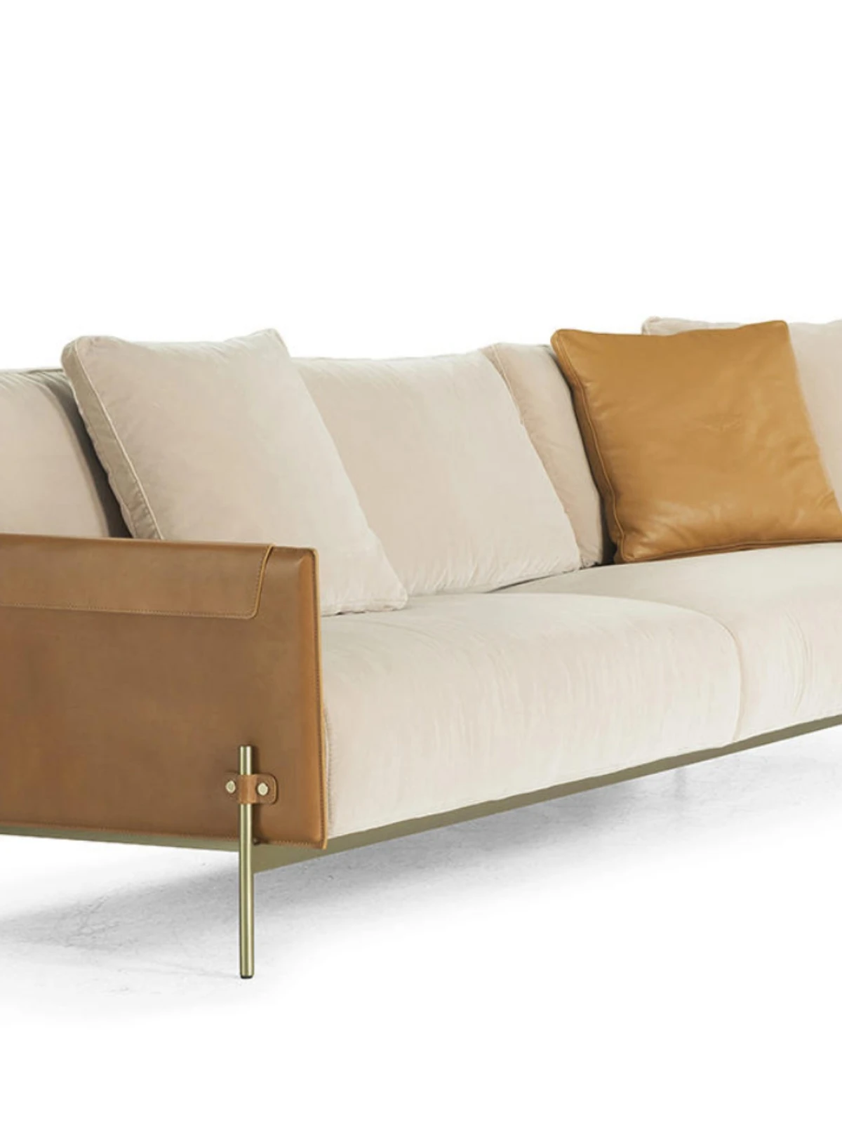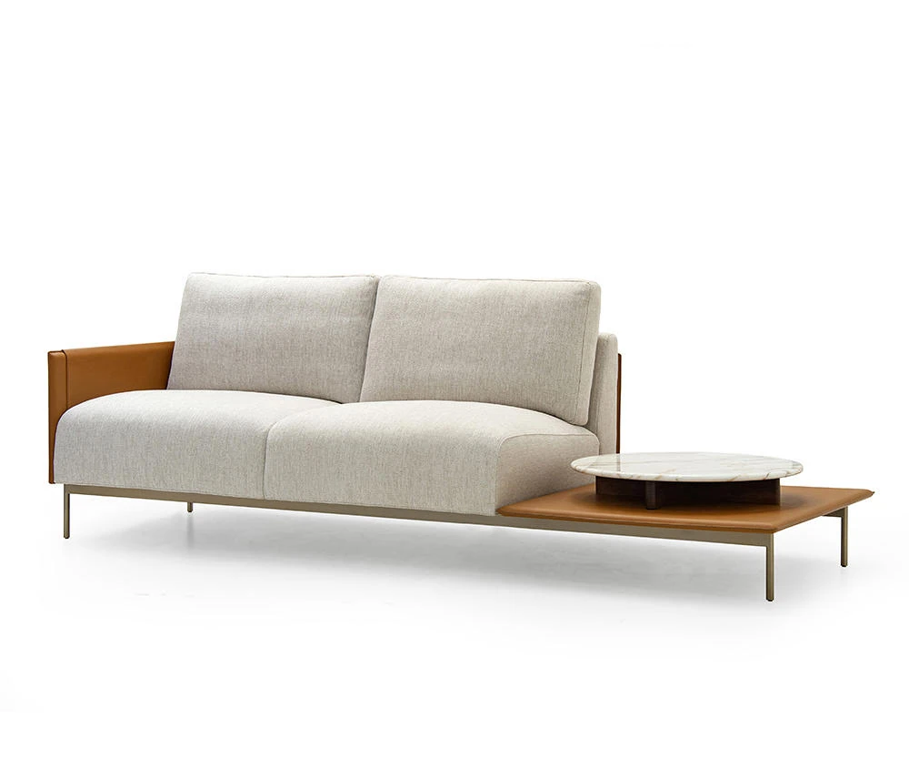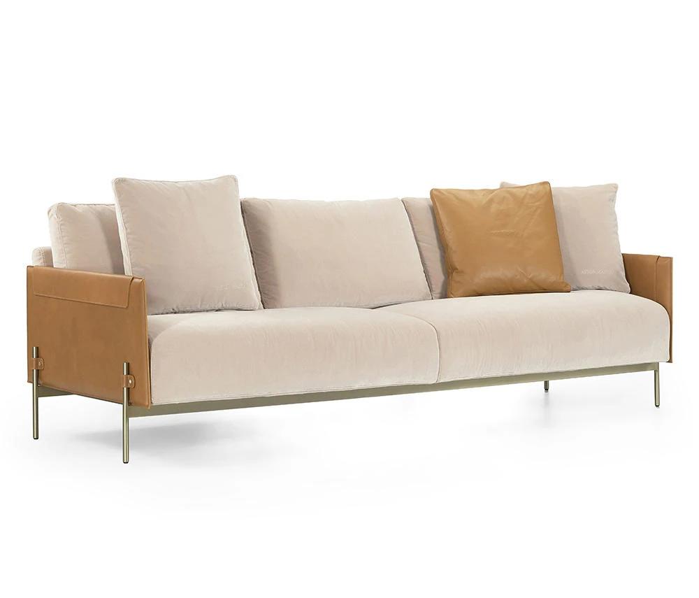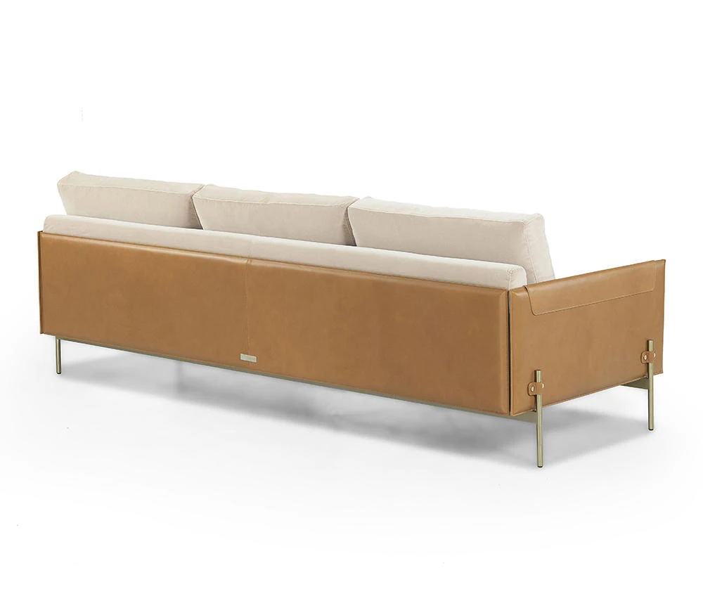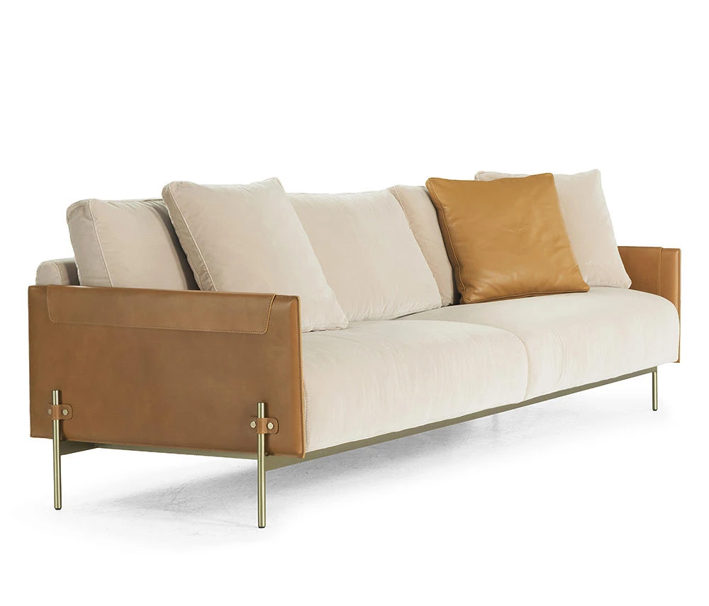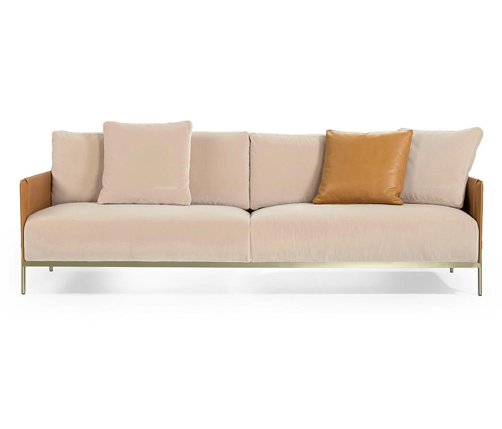 最新デザインのクリエイティブなメタルフレーム、チタンコーティングのレザーとコットンリネンを使用したショップ・民宿向けのラテックスソファ。おしゃれで快適な空間を演出します!