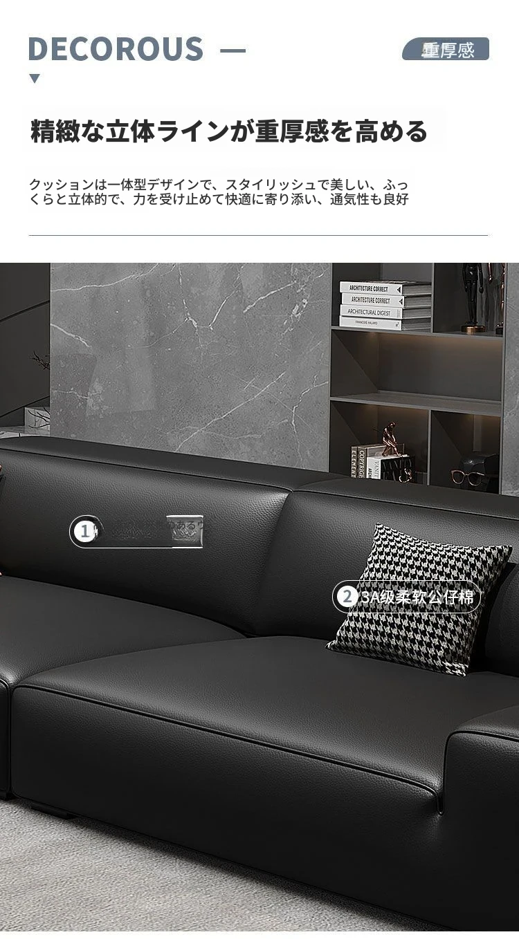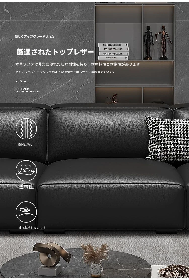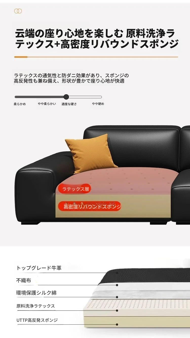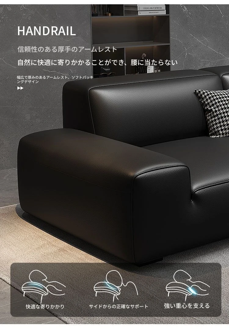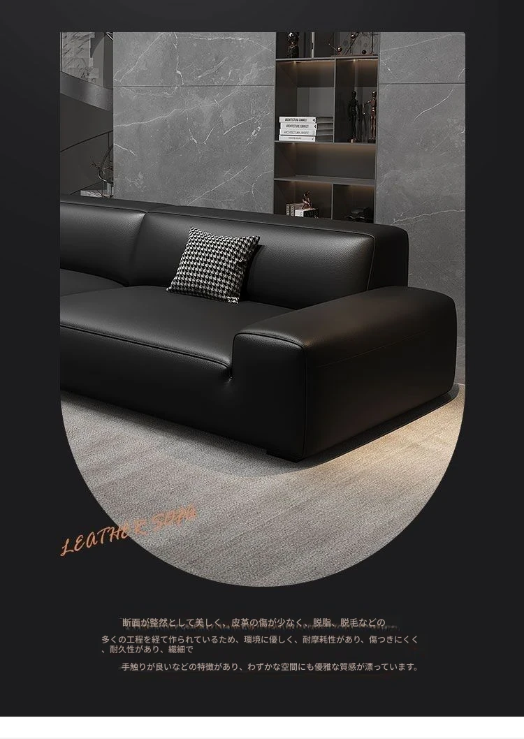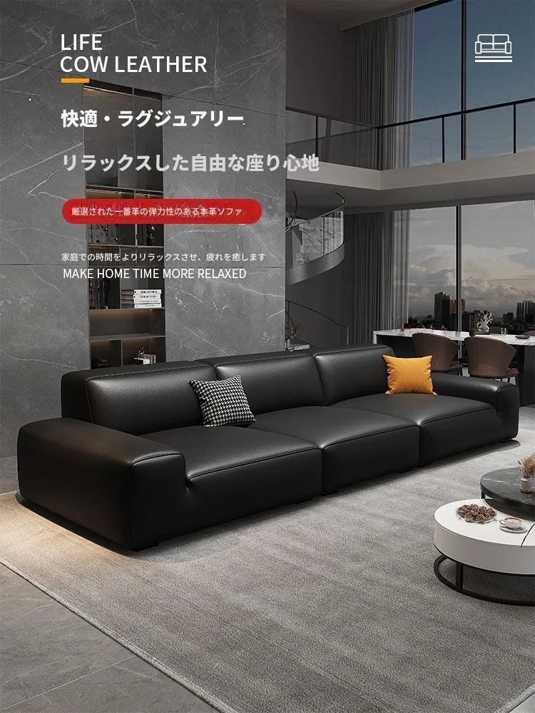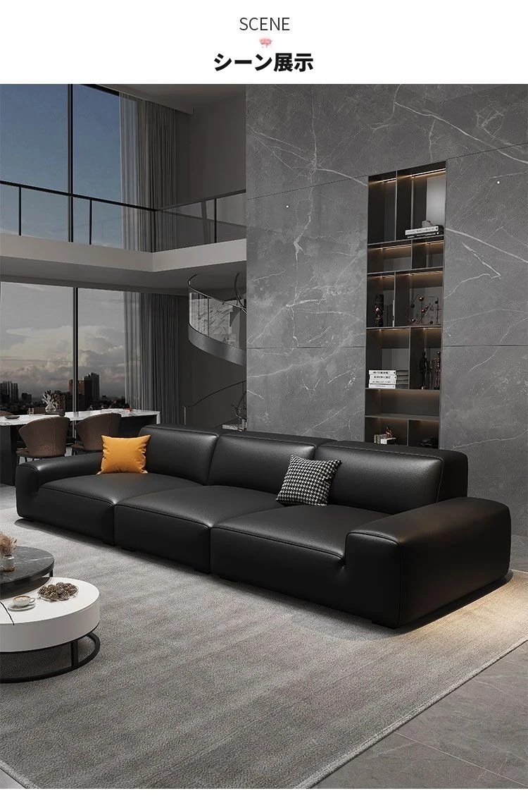 最新モデル!大黒牛革ソファ - イタリアンミニマルデザインの現代的なリビングルームにぴったり!本革のトーフブロック型、直排ラテックスのコンビネーションで、快適さとスタイルを両立!