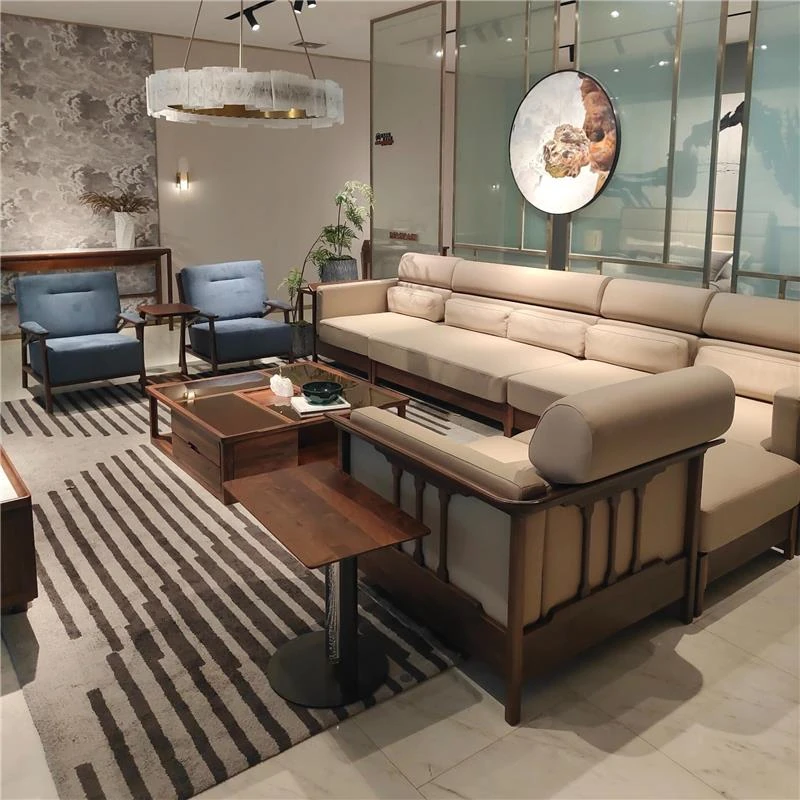 北米産のブラックウォールナットを使用した新中式スタイルの無垢材ソファ。シンプルで現代的な禅の美学を感じさせるソファセット。贅沢な別荘のリビングにぴったりの洗練されたデザインです。