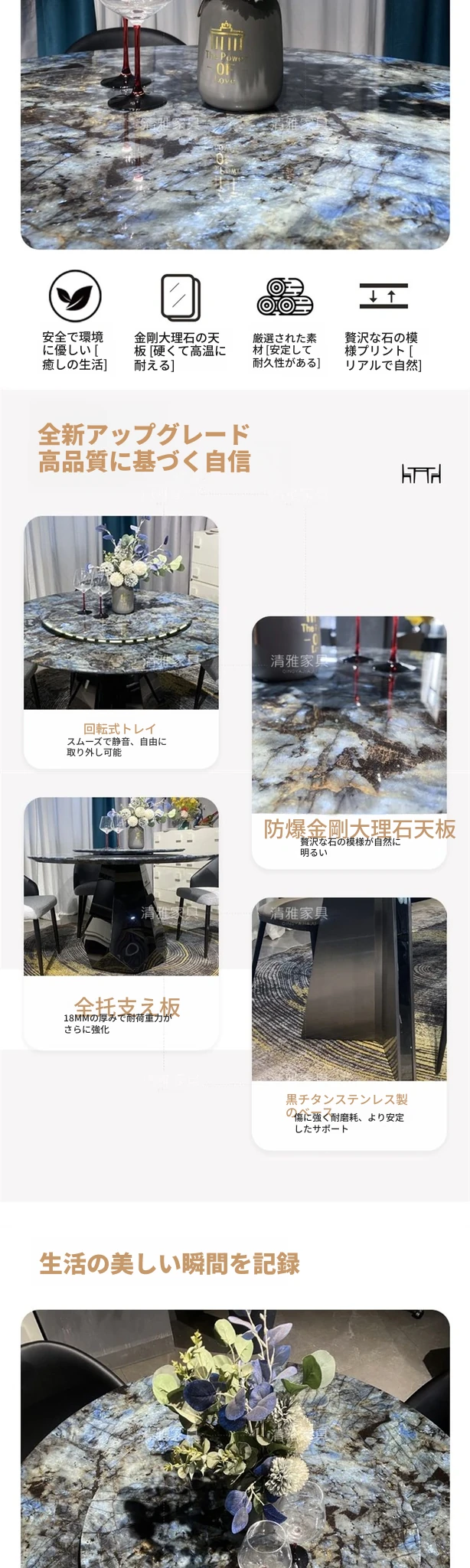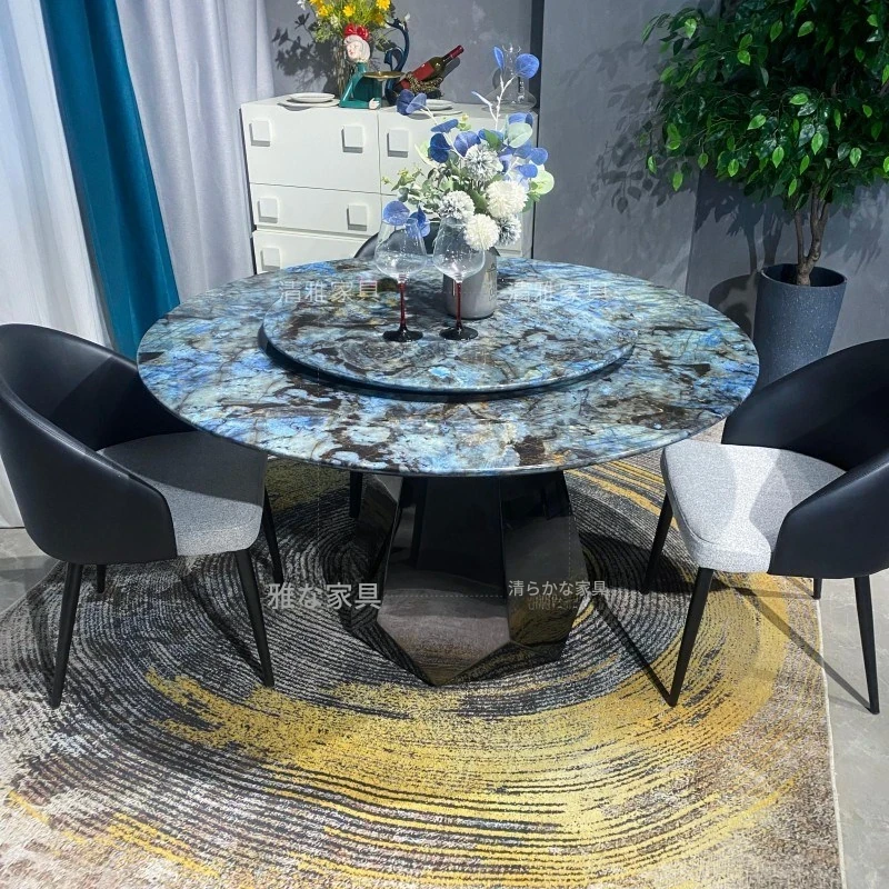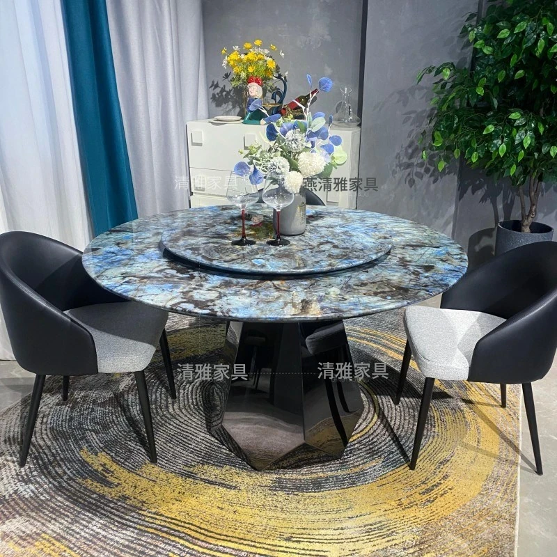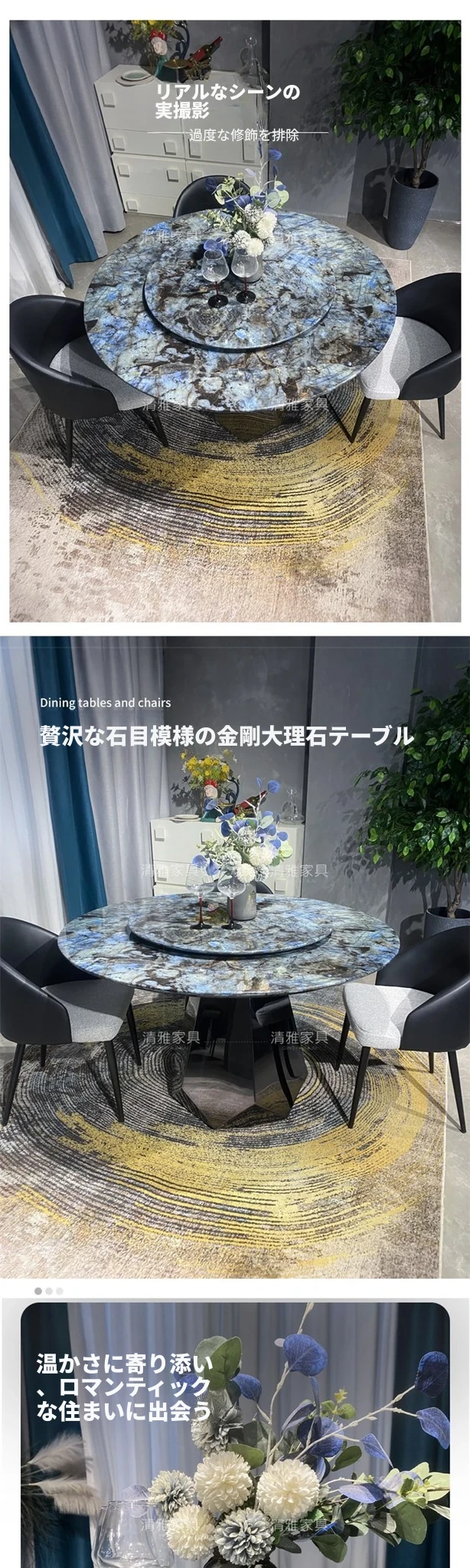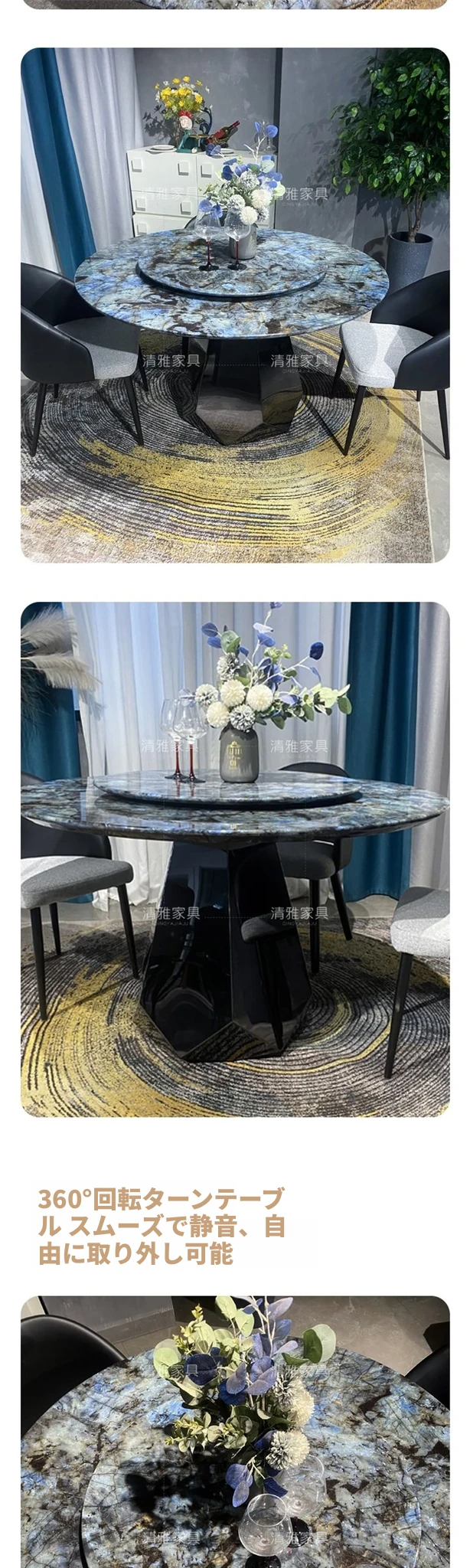 高級感溢れる天然模様のブルージェイド超クリスタル厚型大理石ダイニングテーブル、小型住宅に最適なT型デザイン、回転式の円形テーブルで、食事の楽しみを引き立てます!