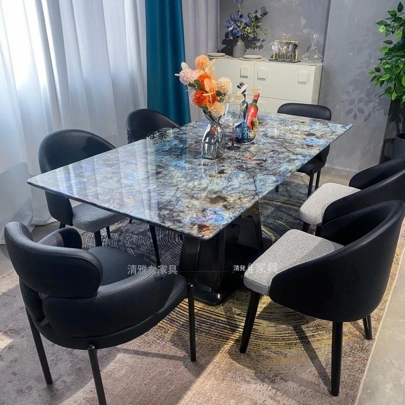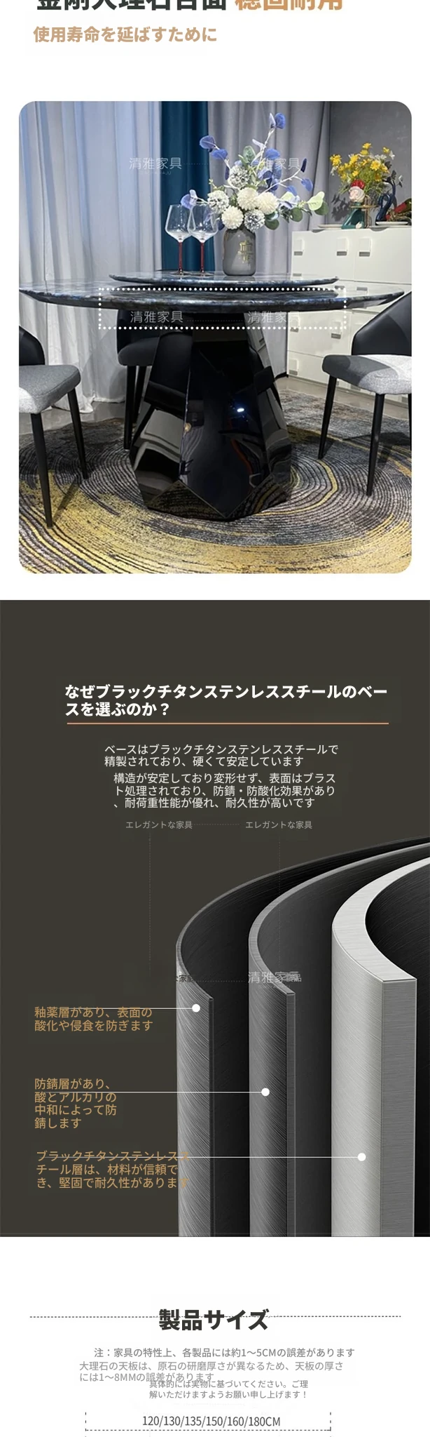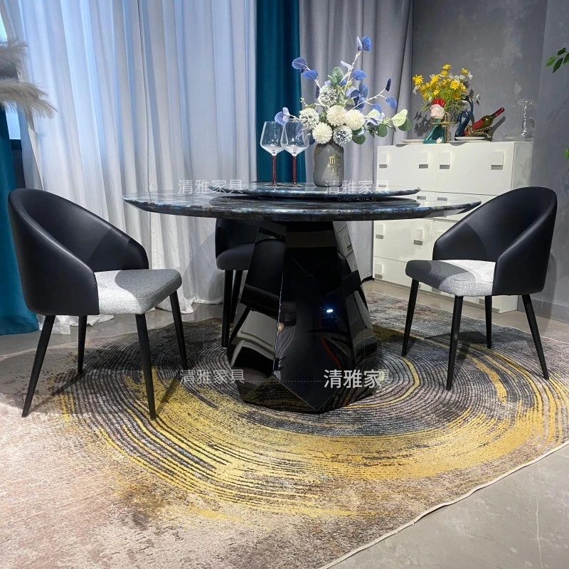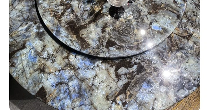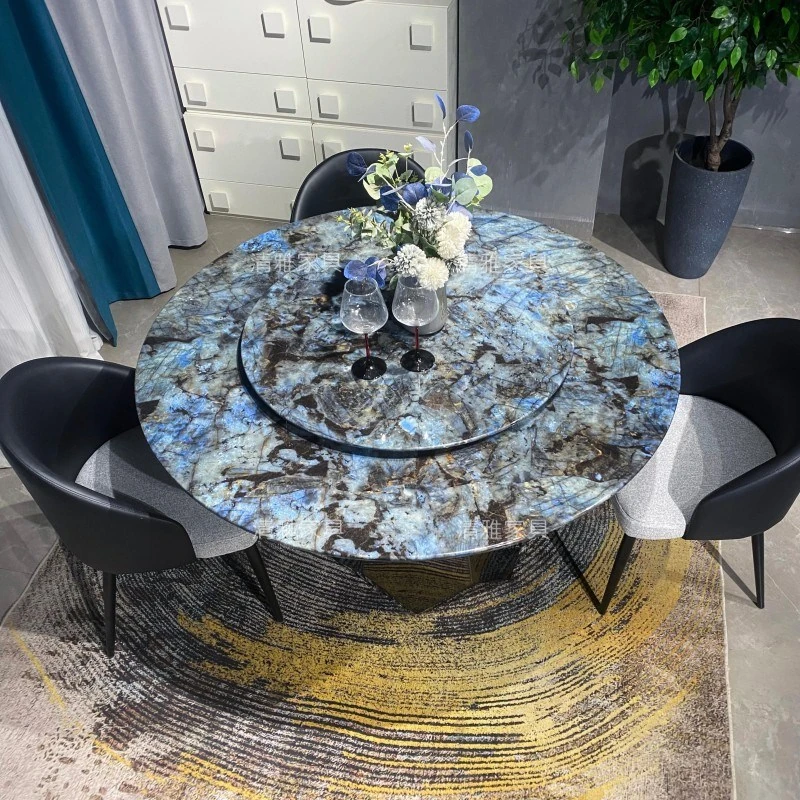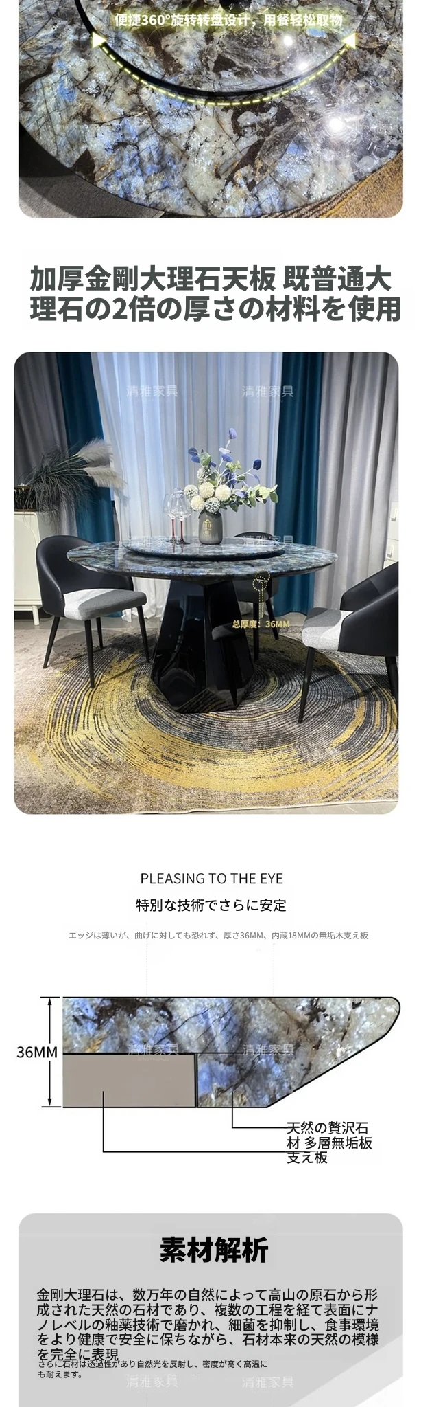 高級感溢れる天然模様のブルージェイド超クリスタル厚型大理石ダイニングテーブル、小型住宅に最適なT型デザイン、回転式の円形テーブルで、食事の楽しみを引き立てます!