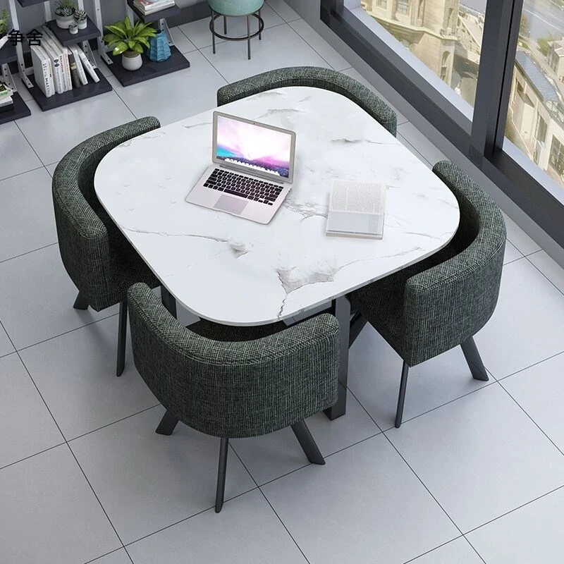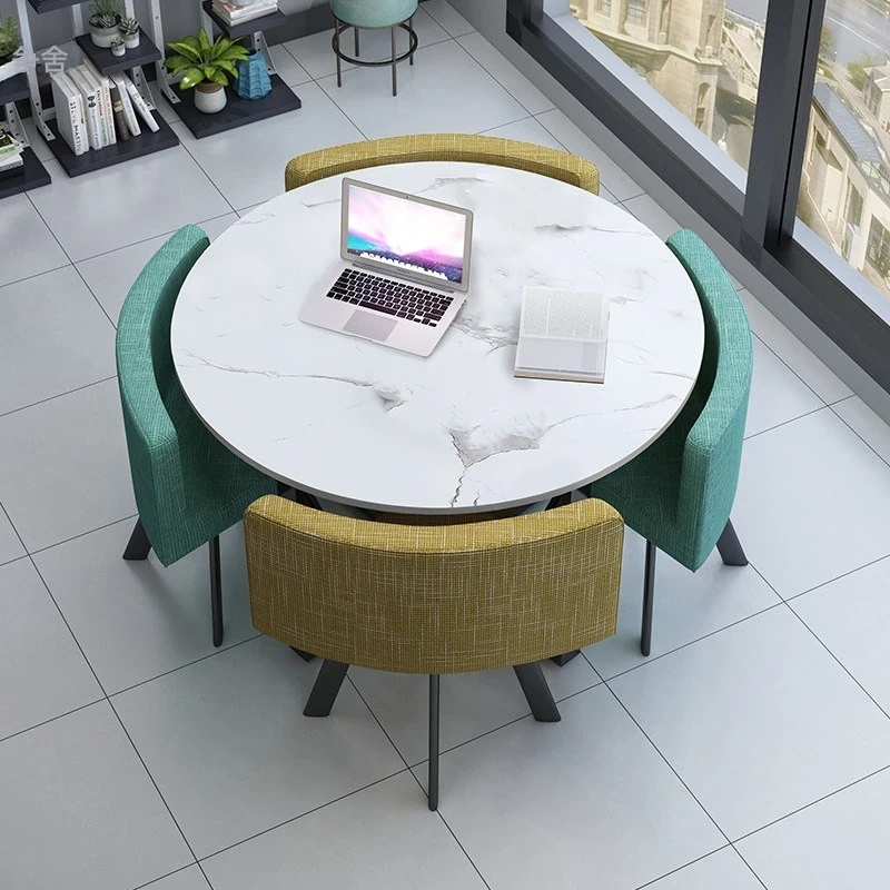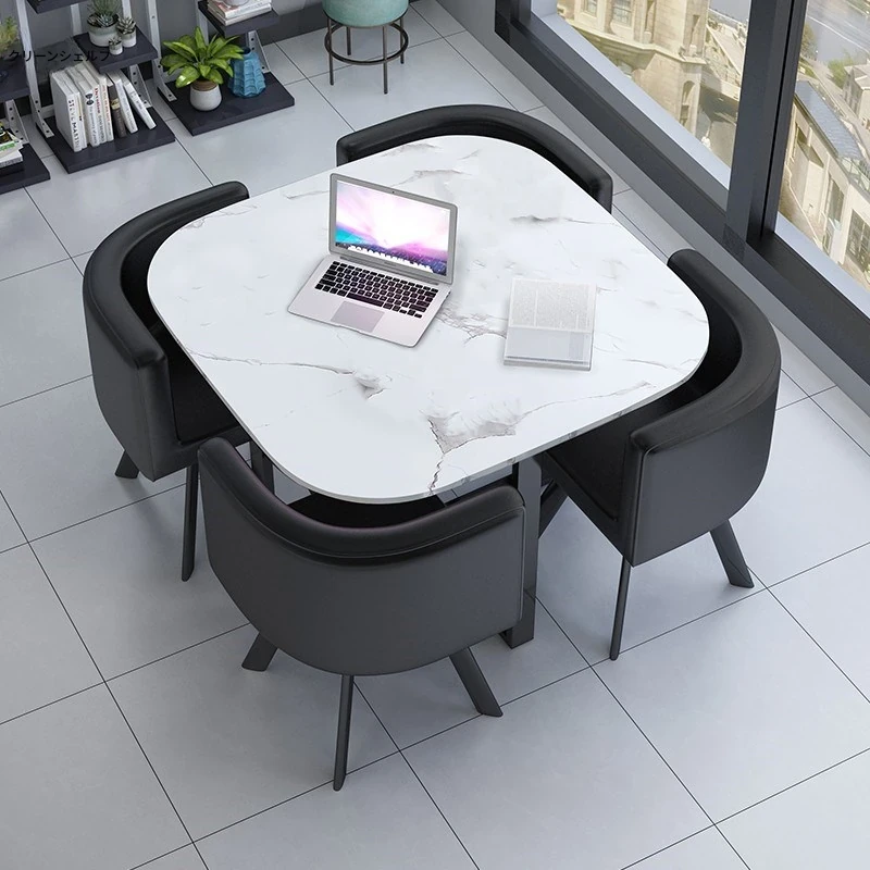 シンプルでスタイリッシュな受付デスク&チェアセット|ビジネスミーティングや商談に最適|オフィスや店舗で使えるリラックス空間を演出する小型ラウンドテーブル付き!