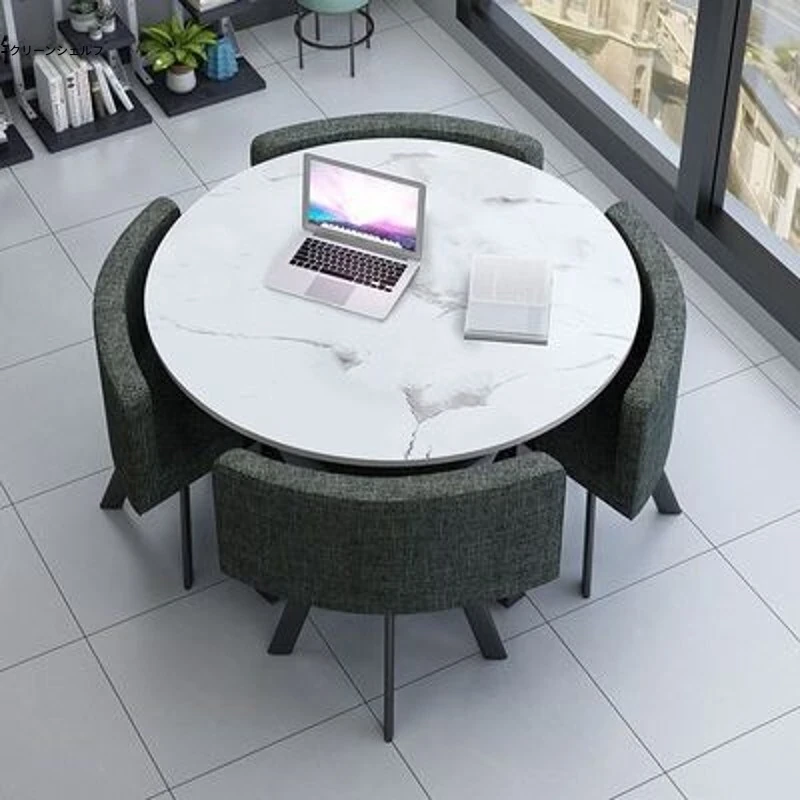 擬石白円 + 緑布椅 1テーブル4椅子90*90*75