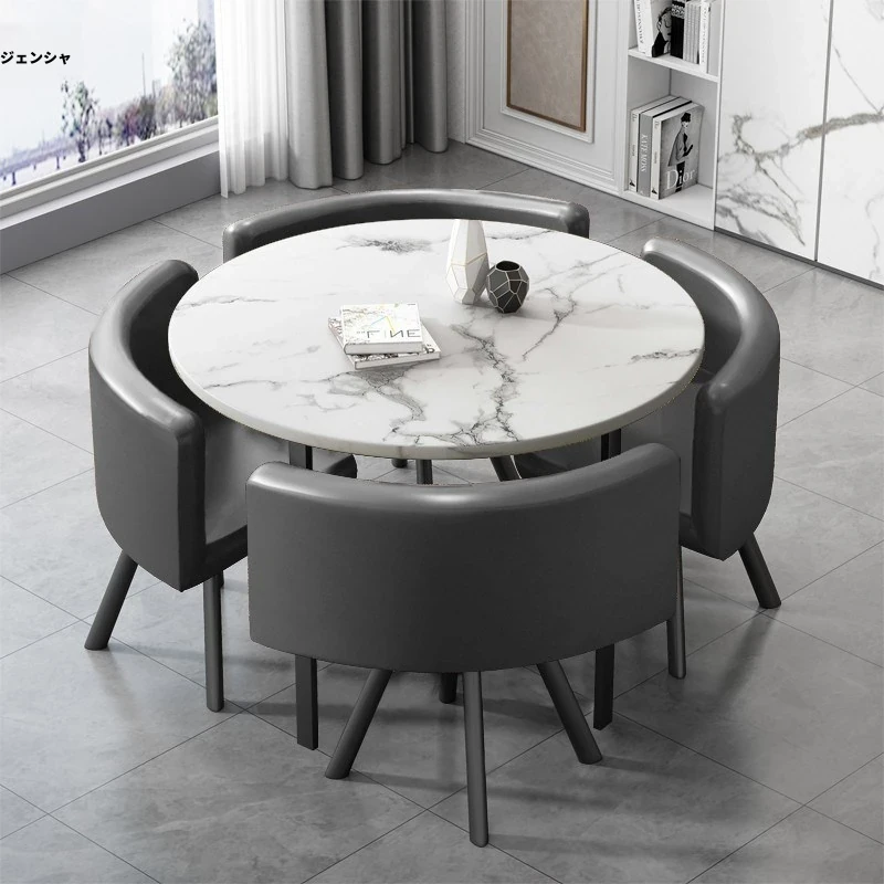 擬石白円 + 灰皮椅 1テーブル4椅子90*90*75