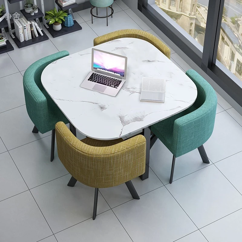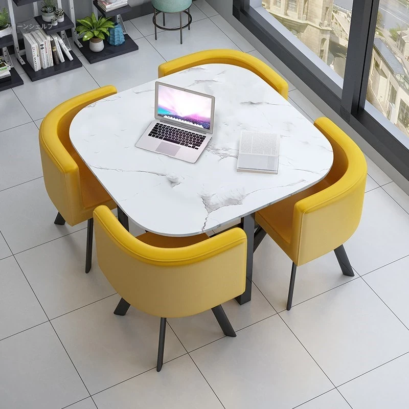 擬石白円面 + 黄青布椅 1テーブル4椅子80*80*75