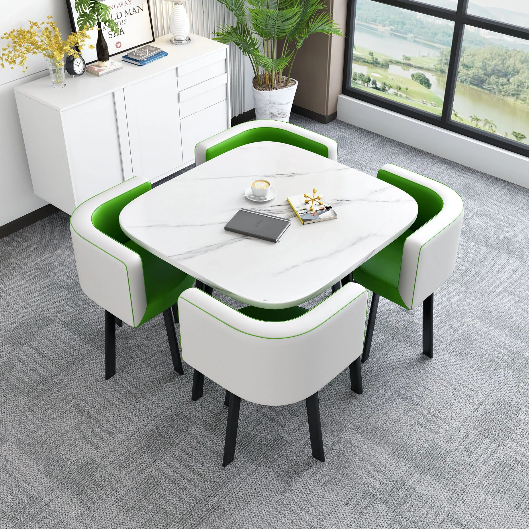 彷大理石四角卓+グリーンホワイトレザー椅子 一卓4椅子