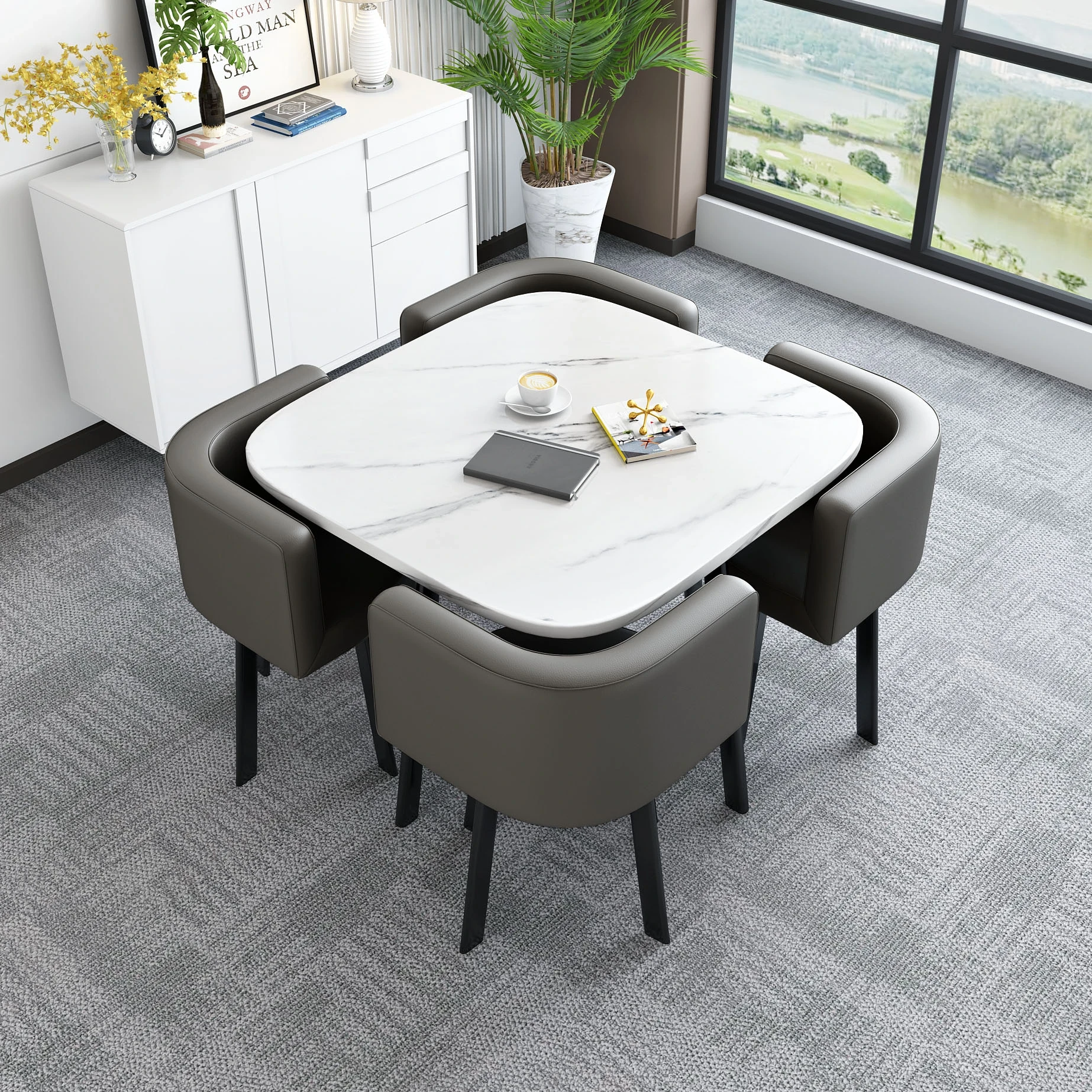 彷大理石四角卓+淡灰レザー椅子 一卓4椅子