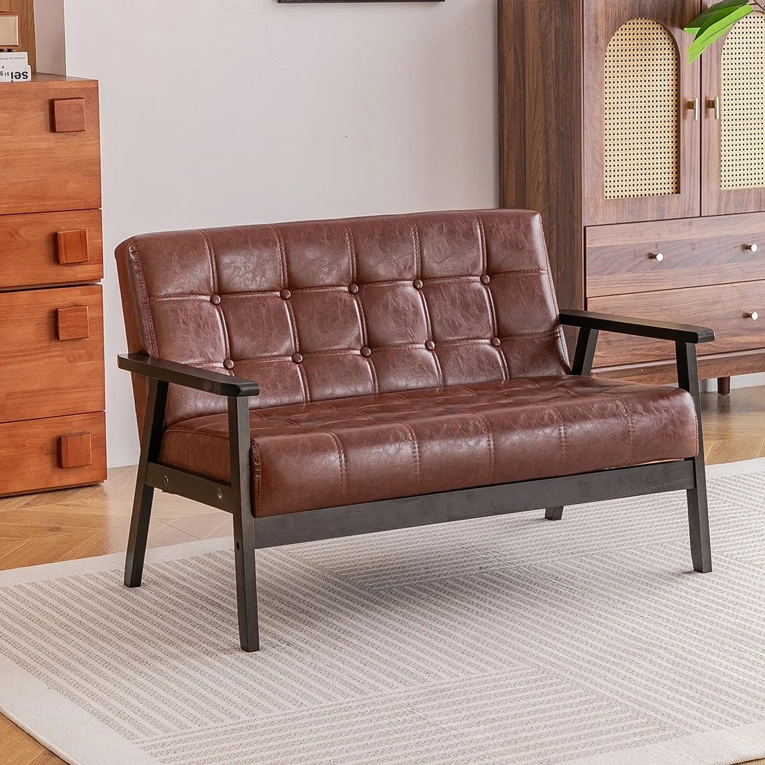 新中式天然木製ソファ|省スペースのモダンデザイン|収納付き引き出し付き|小さなリビングや寝室に最適な2人用ベンチ