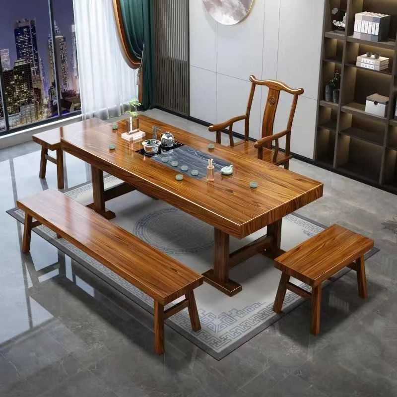 ウコン材の無垢大板茶卓セット - 新中華風の禅の雰囲気を持つ実木製オフィス・家庭用リビング茶台と茶器の組み合わせ。高品質な素材で、心安らぐひとときを演出します。